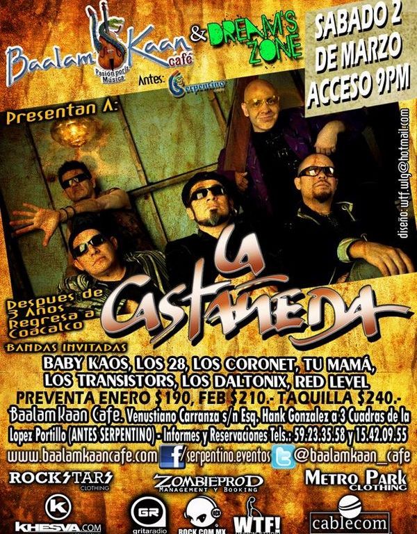 La Castañeda, una de las más míticas y veneradas bandas de la Generación Culebra regresa a Coacalco este próximo 2 de Marzo y en el Baalam Kaan será que tengan la ocasión de celebrar e interpretar su repertorio, mismo que incluye ya varios clásicos del Rock Nacional.