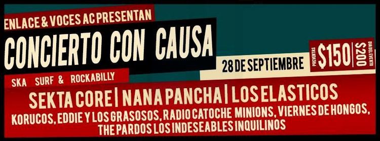 La cita es en el predio conocido como El Zacatón de la Delegación Tlalpan a partir de la 1 de la tarde, donde Sekta Core, Nana Pancha, Los Elásticos, Korucos, Eddie y los Grasosos, Radio Catoche, Minions, Viernes de Hongos, The Pardos y Los Indeseables Inquilinos ofreceran lo mejor de su repertorio para apoyar esta causa.