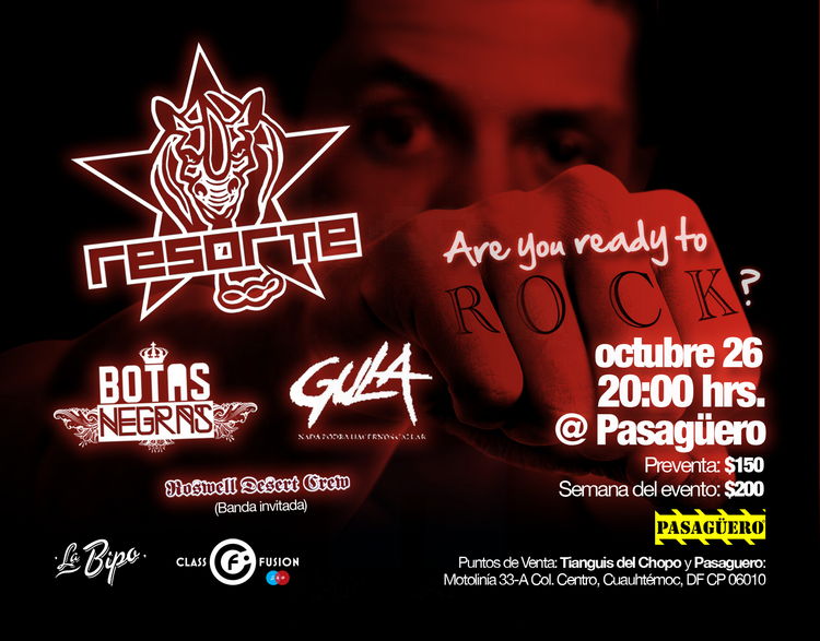 La unión hace la fuerza y este 26 de Octubre, Resorte, Botas Negras y Gula ofreceran una velada cargada de Rock en el Pasagüero, donde tendrán como invitados a Roswell Desert Crew.