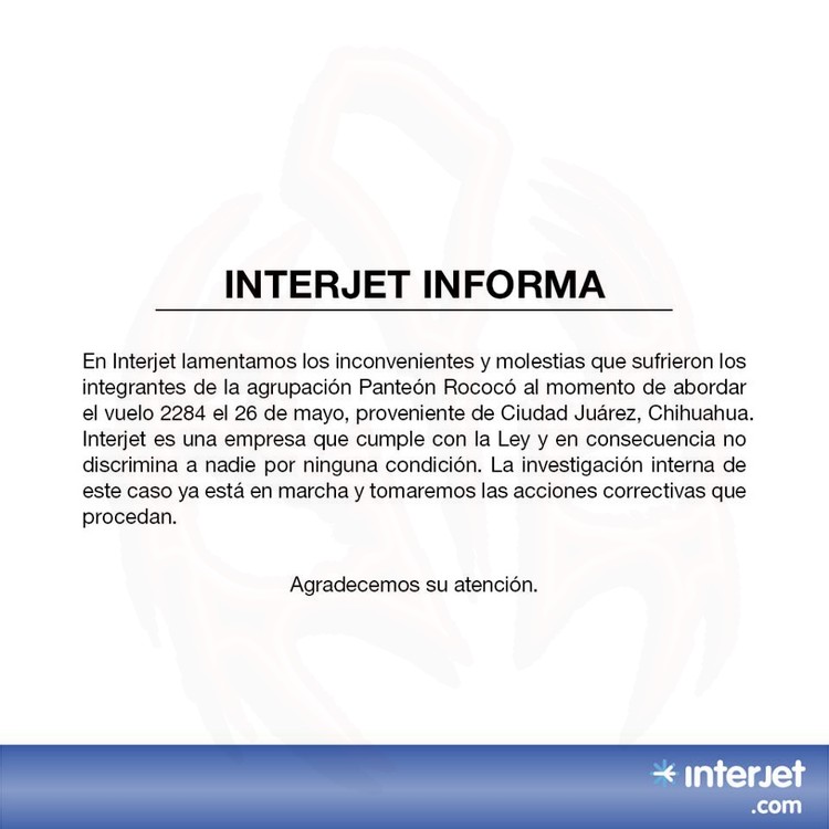 La aerolínea mexicana Interjet se ha pronunciado respecto al caso en el que sus empleados, en representación de la empresa y haciendo uso de las facultades que esta les otorga, pretendieron impedir el acceso a los integrantes de Panteón Rococó al vuelo 2284 el pasado 26 de Mayo, abusando claramente de sus políticas de servicio.