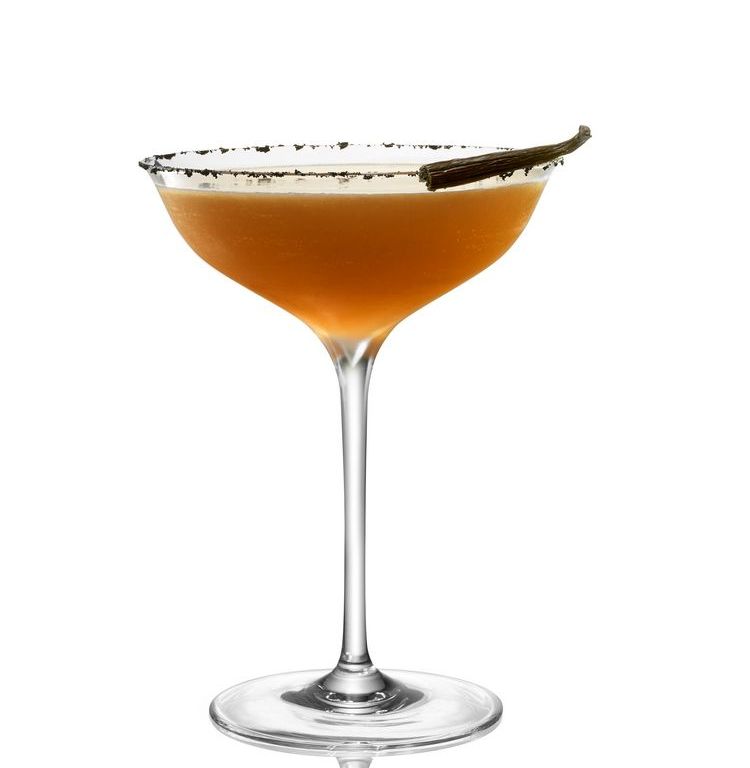 Servir todos los ingredientes en un shaker, agitar vigorosamente y colar dos veces en una coupette con el borde previamente sumergido en vainilla fresca, decorar con una vaina fresca de vainilla.