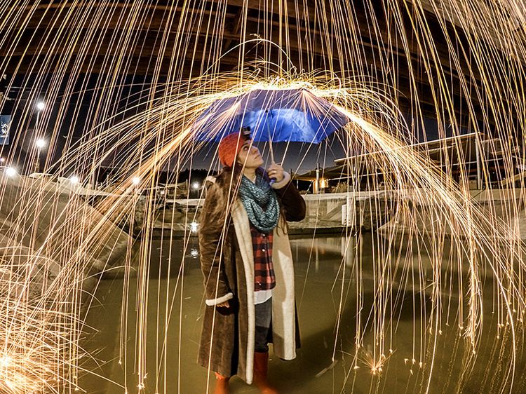 • Tip: Programar 2 segundos de exposición captará las chispas bien, pero este puede ser un tiempo demasiado largo para que la persona permanezca inmóvil. Para evitar esto, puedes utilizar un flash o algunas lámparas para iluminar momentáneamente y congelar el objetivo de la cámara en un momento particular, pues este efecto toma un poco de desenfoque del movimiento de la cámara hacia afuera.