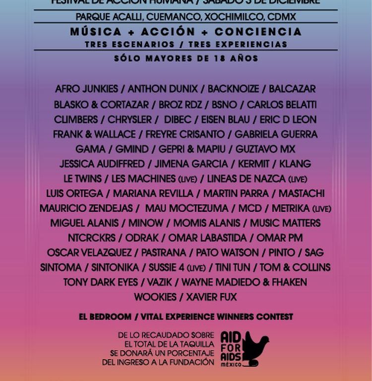 Vital Fest es un evento que convocará a una gran cantidad de DJ’s repartidos en tres escenarios, quienes con su show llevarán al público reunido a un estado de celebración tal en el que se dará forma a este Festival de Acción Humana en pro de la erradicación del VIH/SIDA.