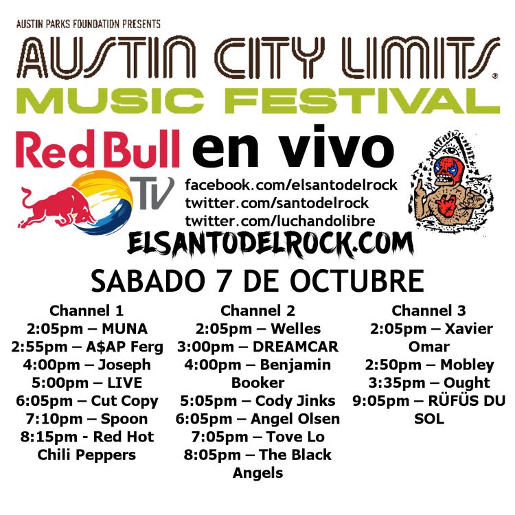Austin City Limits Music Festival 2017 inicia la celebración y el día de hoy, en conjunto con Red Bull TV, traemos para ti las presentaciones en vivo de MUNA, A$AP Ferg, Joseph, LIVE, Cut Copy, Spoon, Red Hot Chili Peppers, Welles, DREAMCAR, Benjamin Booker, Cody Jinks, Angel Olsen, Tove Lo, The Black Angels, Xavier Omar, Mobley, Ought, RÜFÜS DU SOL y una que otra sorpresa que, sin duda será una de las más memorables del fin de semana.