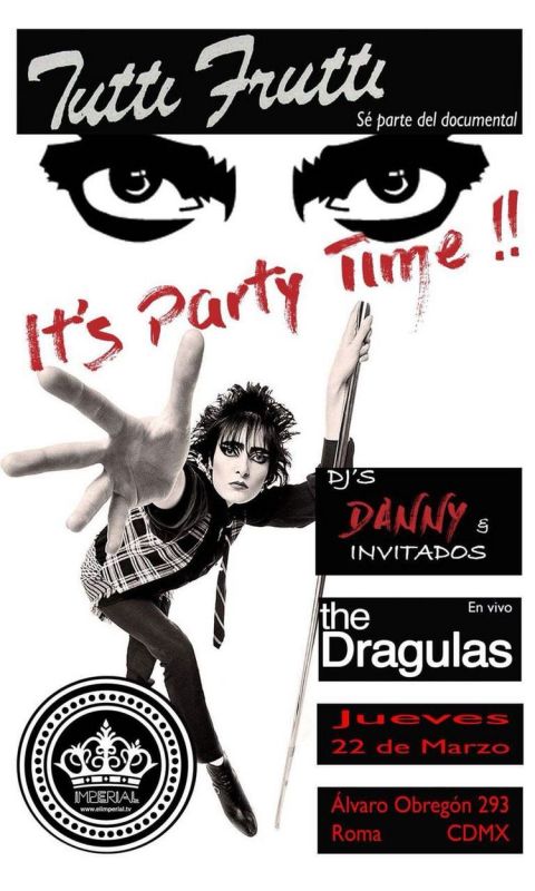 Este 22 de Marzo regresa el Tutti Frutti a El Imperial, para presentar el documental de Laura Ponte con una fiesta en la que el Danny presentará un dj set mientras que The Dragulas tocarán algunas rolitas de la época para amenizar.
