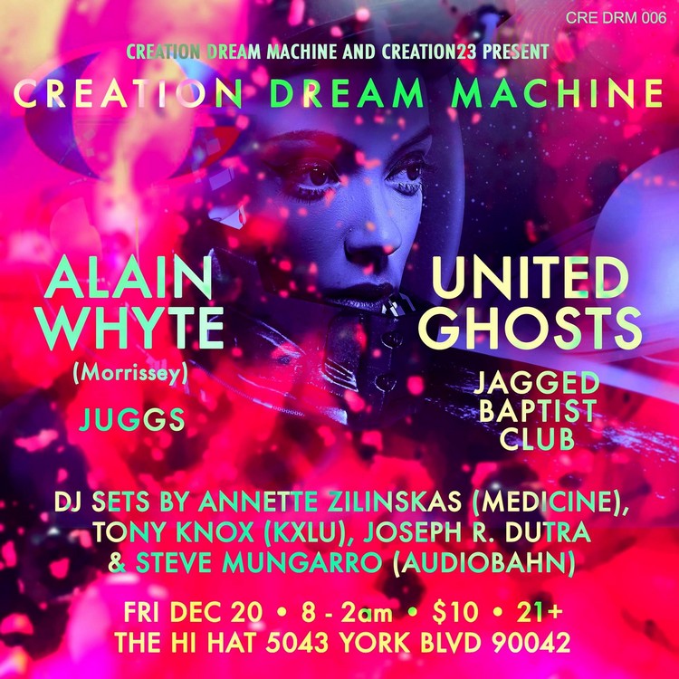 Creation Dream Machine 006 tiene un elenco más que interesante, pues la fiesta será amenizada por Alain Whyte (Morrissey), United Ghosts, JUGGS, Jagged Baptist Club + Medicine’s Annette Zilinskas, Tony Knox (KXLU), Joseph R. Dutra y Steve Mungarro (Audiobahn) este Diciembre 20 en The Hi Hat.
